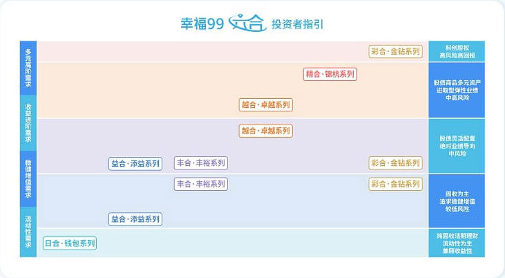 杭银理财传承原有“幸福99”品牌文化,融入以合为本、合家欢乐、共同富裕的幸福概念,以“日益丰,越精彩”寓意“物质日益富足、生活越发精彩”的幸福元素,体现杭银理财致力于成为百姓信赖的财富管理专家的担当与信念。杭银理财结合原有品牌价值、财富管理需求,设立以“日合、益合、丰合、越合、精合、彩合”为核心的“六合”产品体系,分别对应“现金管理类、开放式固收类、封闭式固收类、混合类、权益及另类、私募类”六大产品类型,以不同的资产投向、产品形态配合客户体验及风险偏好,力争为投资者打造风险收益特征鲜明、具有阶梯层次的产品体系。